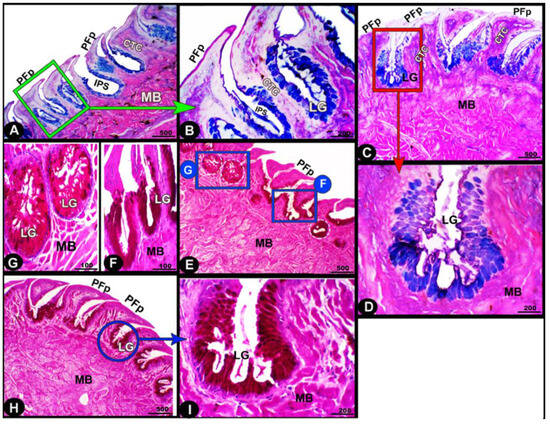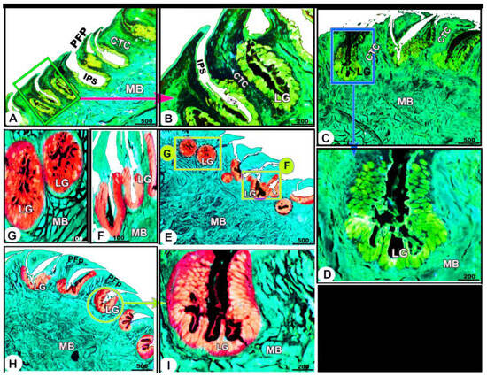 Histochemical micrograph image (views (A–I)) of the Heremites vittatus tongue showing the negative image of Figure 8 to clarify the pointed filiform papillae (PFP), interpapillary space (IPS), connective tissue core (CTC), muscle bundles (MB), and glands (LG). Note: the glands displayed strong AB and PAS-positive reactions, in which the blue color indicates positive AB reactivity while the red color indicates PAS reactions. PAS and AB stain.