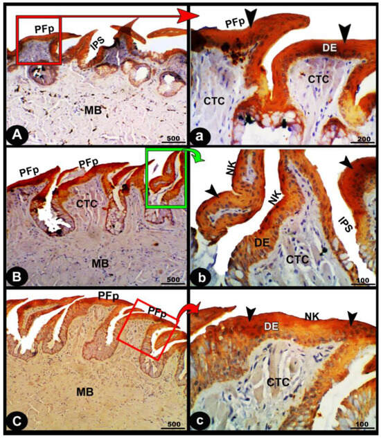 Immunohistological micrographs for cytokeratin of the dorsal surface of the foretongue (views (A,a)), midtongue (views (B,b)), and hindtongue (views (C,c)) of the Heremites vittatus tongue. The pointed filiform papillae (PFP), interpapillary space (IPS), connective tissue core (CTC), muscle bundles (MB), keratinized (KE) or non-keratinized (NK) squamous epithelium (DE), keratinized layer (black arrowheads), and glands (LG). Note: in immunohistochemistry analysis, there was a strong cytokeratin immunopositivity in all parts of the tongue (black arrowheads).
