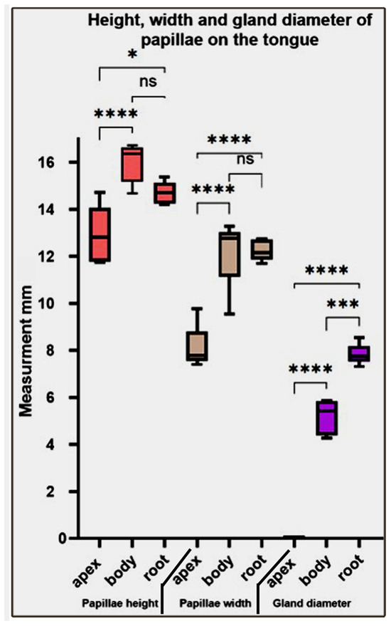 Our statistical analysis of the height, width, and gland diameter of papillae on different parts of the tongue revealed that the papillae height and width significantly increased from the fore- to midtongue and non-significantly decreased towards the hindtongue. While the gland diameter gradually and significantly increases from the foretongue towards the hindtongue (Figure 11).