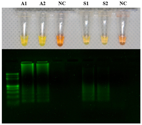 Detection of DNA amplification in the loop-mediated isothermal amplification (LAMP) assay by a change in color from orange to yellow. LAMP results in addition of SYBR green dye showing A1 and A2 as positive for Aeromonas hydrophila, S1 and S2 as positive for Streptococcus agalactiae, and NC (negative control) as a negative reaction. The LAMP reaction product was analyzed on a 2% agarose gel.