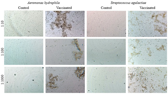 Studies showed a greater agglutination titer after fish vaccination against Streptococcus spp. and Aeromonas spp. [43,44,45,46]. In the present study, agglutination was shown to be increased for A. hydrophila and S. agalactiae in the three dilutions tested after 30 days of vaccination in the laboratory experiment, confirming that the vaccine induced the production of antibodies to both bacteria.