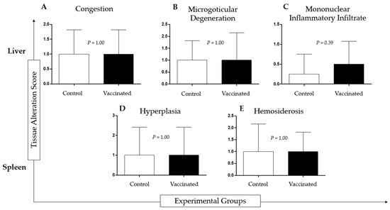 Histopathological analysis of tilapia livers from both groups showed congestion, diffuse or multifocal microgoticular degeneration, and diffuse or multifocal mononuclear inflammatory infiltrate. Analysis of the spleen of tilapia from both groups revealed white pulp hyperplasia (vaccinated group), red pulp hyperplasia (control group), and hemosiderosis. There was no statistical difference between the vaccinated and control groups. (Figure 3).
