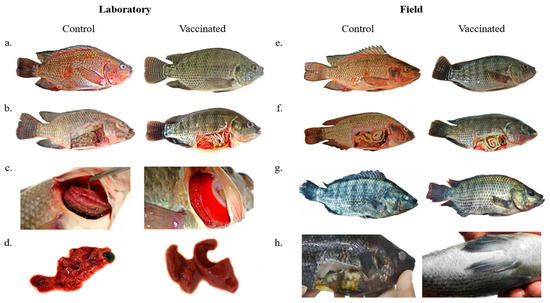 (a) Control group fish after experimental infection with A. hydrophila and S. agalactiae presenting body and fin hemorrhages and ulcerative lesions. Fish from the vaccinated group showing no external clinical signs after experimental infection. (b) Control group fish after experimental infection with A. hydrophila and S. agalactiae presenting skin pallor, yellowish fluid in the visceral cavity, and organ deterioration. Fish from the vaccinated group showing no internal clinical signs after experimental infection. (c) Control group fish after experimental infection with A. hydrophila and S. agalactiae presenting excess mucus, necrosis, and pallor of the gills. Fish gills of the vaccinated group with normal appearance and color after experimental infection. (d) Fish liver from the control group after experimental infection with A. hydrophila and S. agalactiae showing deterioration and hemorrhage. Fish liver of the vaccinated group showing normal appearance and color after experimental infection. (e) Control group fish presenting body and fin hemorrhages. Vaccinated group fish showing no external clinical signs. (f) Control group fish presenting skin pallor, yellowish fluid in the visceral cavity, and organ deterioration. Vaccinated group fish showing no internal clinical signs. (g) Control group fish presenting tail rot and corneal opacity. Vaccinated group fish showing weight gain and no clinical signs. (h) Control group fish showing skin darkening, corneal opacity, and internal organ deterioration.