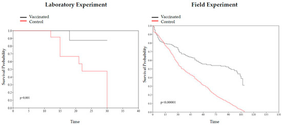 Kaplan–Meier survival curve and log-rank test comparing the vaccinated and control groups from laboratory (p = 0.001) and field (p < 0.00001) experiments.