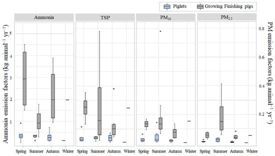 The emission calculations for PM and ammonia were a product of the facility’s ventilation rate and the emission concentration. These emissions were highly influenced by climate and seasonal variations [,,,,,,]. In mechanically ventilated buildings, high ventilation rates were maintained to alleviate the heat stress of animals in summer, which in turn reduced the concentration of indoor concentrations of PM and ammonia. Conversely, during winter, minimised ventilation rates were maintained to conserve thermal energy, resulting in elevated indoor concentrations. Although our current emission factors were calculated assuming a year-long uniformity, understanding the seasonal fluctuations in emissions is crucial for effective livestock management and local environmental conservation. In this study, the data collected during the entire experimental period were divided into four seasons: spring (March–May), summer (June–August), autumn (September–November), and winter (December–February). The emission factors were then calculated for each season.
