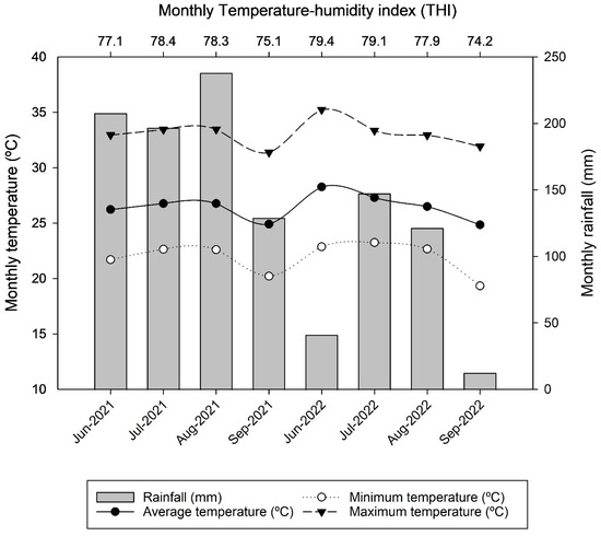 This study was carried out at the University of Florida, Institute of Food and Agricultural Sciences (UF/IFAS), North Florida Research and Education Center, Marianna, FL, USA, during the summers (June to September) of 2021 and 2022. Twelve paddocks (30°51′47.96″ N; 85°11′4.78″ W) of common bermudagrass, approximately 1.3 ha each in area, were established (Cynodon dactylon (L.) Pers.). Climatic data for the experimental period were collected at the Florida Automated Weather Network (FAWN). The monthly accumulated rainfall, temperature (average, minimum, and maximum), and temperature–humidity index (THI) for both experimental years (2021 and 2022) are reported in Figure 1. The THI was calculated using the dry bulb temperature (Tdb, °C), and relative humidity (%; RH) according to the equation described by [25].