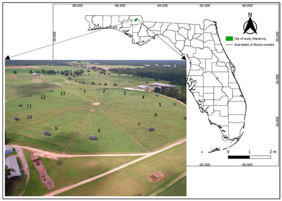 Map of Florida and drone image highlighting the experimental site. Paddocks 2, 4, 8, and 11 were weed-free; paddocks 5, 9, 12, and 13 were established with alternated weed-strips; and paddocks 1, 6, 7, and 10 were weed-infested. Paddock 3 was not used.
