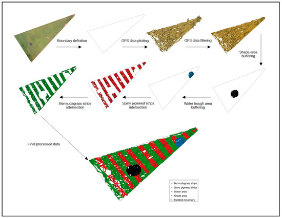 To estimate the daily time spent (%) by the animals in areas of water and shade, as well as the time spent in each strip (bermudagrass × spiny pigweed) in the weed-strip treatment paddocks, we used the vector tools of the referred GIS software (QGIS® v. 3.22.14) to generate an additional shapefile for each spot of interest (i.e., shade, water, bermudagrass strips, and spiny pigweed strips). The geographic coordinates of each corner of the artificial shades, water troughs, and weed strips had previously been taken by a conventional GPS using a smartphone (Coordinates-GPS Formatter app V. 7.8.0). To minimize the inaccuracy of the smartphone GPS, we rasterized the vector points and used a georeferenced Google Earth image and the “georeferencer” tool in QGIS® software to adjust the shade and water trough areas. To consider the shade projection, the area around the water troughs, and the remaining inaccuracy of the smartphone–GPS system, we generated a new shapefile for shade and water troughs with a round buffer of 10 m from the original coordinate using the geoprocessing “buffer” tool of the software QGIS®. To estimate the percentage of daily time spent near shade or water, we used the spatial analyst tools in the same mapping program to calculate the percentage of GPS points inside of each buffered area (shade or water) through the intersection between the filtered GPS points and the respective area of interest. For weed-strip treatments, the same approach was adopted to estimate the percentage of time spent by grazing animals in the bermudagrass strips or spiny pigweed strips. Data were averaged across five evaluation periods and two years of study for each treatment. Figure 3 represents a flowchart of the data processing in the GIS software (QGIS® v. 3.22.14).