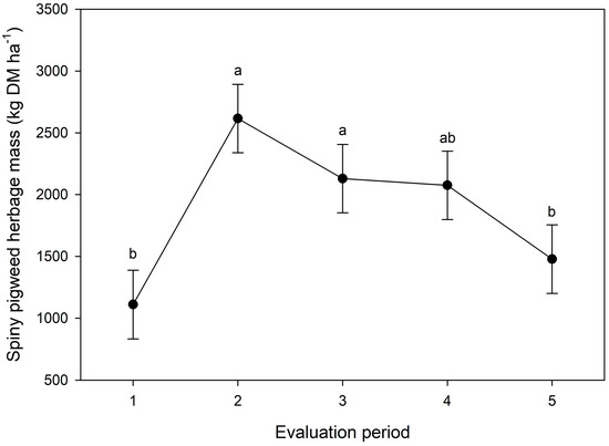 The spiny pigweed HM was also affected by the evaluation period (p < 0.05), with a peak of HM in the second evaluation period and lower HM observed for the first and last periods of evaluation (Figure 4).