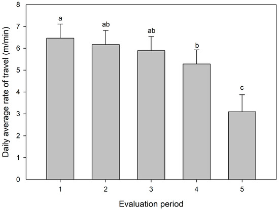 Daily average grazing rate of travel for the animals throughout five evaluation periods. Bars with different letters are significantly different (p < 0.05).