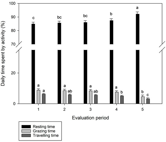 Daily time spent by grazing animals engaging in different activities throughout five evaluation periods. a–c LSMeans followed by the same letter did not differ among treatments at p < 0.05. Error bars represent ± standard errors of the means.