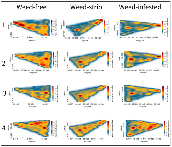 Heatmaps of grazing animals’ distribution based on kernel density estimation for different levels of pasture weed encroachment during four evaluation periods in 2021. The left number represents the evaluation periods (1–4), and areas in dark red represent hotspots of animal distribution.