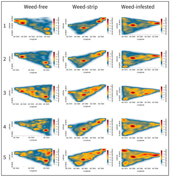 Heatmaps of grazing animals’ distribution based on kernel density estimation for different levels of pasture weed encroachment during four evaluation periods in 2022. The left number represents the evaluation periods (1–5), and areas in dark red represent hotspots of animal distribution.