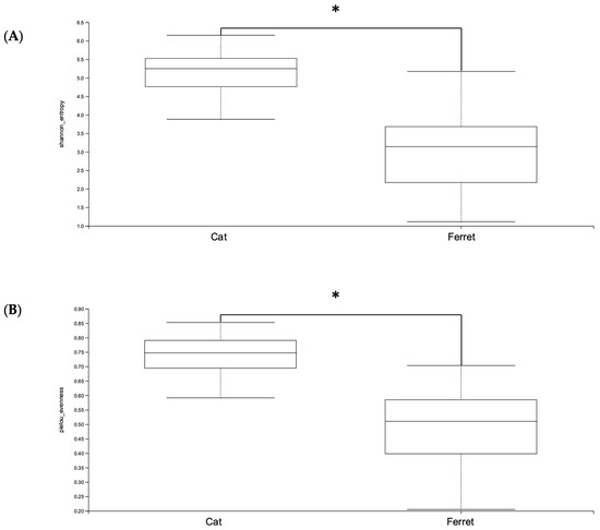 Alpha diversity—(A) Shannon and (B) Pielou’s Evenness indexes—of Amplicon Sequence Variants (ASVs) of healthy ferrets and healthy cats. A Kruskal–Wallis non-parametric test was applied, and significant differences were determined from p < 0.05. * denotes p < 0.05.