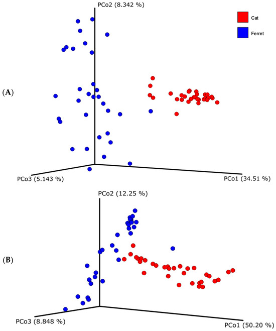 Beta diversity based on unweighted (A) and weighted (B) Unifrac dissimilarity distance matrices, plotted in a Principal Coordinate Analysis (PCoA). Blue dots represent healthy ferrets and red dots represent healthy cats.