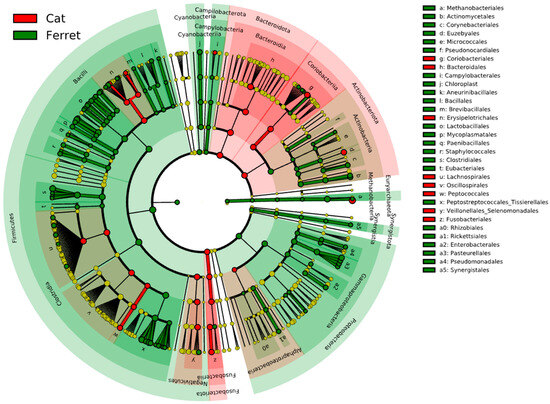 Cladogram reporting the taxonomic representation of statistically and biologically consistent differences (according to LEfSe) between healthy domestic ferrets (highlighted in green) and healthy domestic cats (highlighted in red).