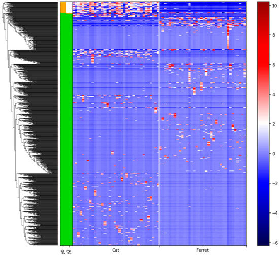 Dendrogram heatmap showing the differential abundances of bacteria between ferrets and cats based on gneiss analysis. A gradient from red to blue is indicating the ASVs log10 abundances, from high (red) to low (blue). Green color of the bars is representing the denominator of the balances and the orange color is representing the numerator of the balances.