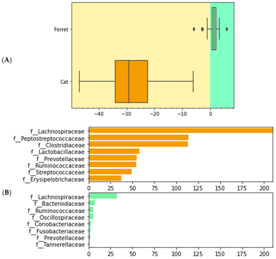 We used differential abundance testing using balances in the gneiss analysis to identify bacteria taxa with different RAs within the two groups of animals. In Figure 4, it was represented as a dendrogram heatmap, taking into consideration the y0 and y2 balances. These balances showed the most significant differences between the taxa of the fecal microbiomes of the ferrets and cats. Indeed, it was possible to observe a separation based on the abundances of certain bacteria. Figure 5A is a box plot, grouped by species, to illustrate how well balance y0—shown as the x axis—can separate ferrets from cats. The box plot highlights a very clear separation, and the effect size between the ferrets and cats was found to be quite large, indicated by the fact that y0 was the main balance with the largest variance. Figure 5B shows which taxa make up the balance, where the green color represents the denominator of balance y0 and the orange color represents the numerator of the same balance.