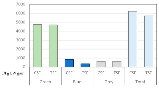 The average water footprint of the ADG calculated over the whole experimental period was 6221.29 L in the CSF group and 5703.60 L in the TSF group. Therefore, the WF difference per kg LWG was 517.70 L between the two groups (Figure 1). The daily average intake of green, blue and grey water in the groups CSF and TSF was 76.09%, 13.59% and 10.32% and 82.45%, 6.37% and 11.18%, respectively. Gerbens-Leenes et al. [], in a study on WF industrial beef production in four countries, reported values (L/kg LW) in the interval 4000–5000 in the NL and the USA, and close to 9000 in Brazil and 13,000 in China. This study also illustrated that choosing feed ingredients and sourcing wisely, and particularly substituting crops with co-products or crop residues, will help to improve the WP of livestock products, thus reducing the pressure the sector puts on scarce water resources. The highest total WF for beef production was evidenced in Brazil by Palhares et al. [] with values ranging from 9249 to 23,521 L/kg LW. In another study in Arcadia Valley (MO, USA), Eady et al. [] compared two rearing systems in beef cattle production, a farm with 634 cows delivering weaners and a farm with 720 cows delivering finished cattle; green water use ranged from 7400 to 12,700 L/kg LW depending on the class of livestock, with on-farm blue water use of 51–96 L/kg liveweight and off-farm blue water use of 0.1–59 L/kg LW.