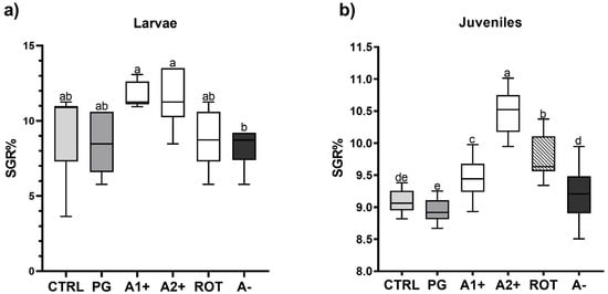 As regards juveniles (Figure 1b), no significant differences were detected between the CTRL and PG groups (9.08 ± 0.16 and 8.95 ± 0.17%). Fish fed A1+, A2+, and ROT diets showed a significantly (p < 0.05) higher SGR% (9.46 ± 0.31, 10.45 ± 0.31, and 9.77 ± 0.30% for the A1+, A2+, and ROT groups, respectively) compared to those fed CTRL and PG diets. Finally, the A group (9.22 ± 0.38%) did not evidence significant differences compared to the CTRL group.