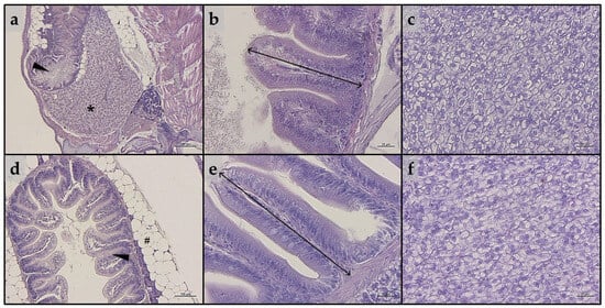 Figure 3. Example of histomorphology of intestine and liver parenchyma of zebrafish (ac) larvae and (df) juveniles from the present study. (a) Representative section of liver (*) and intestine (arrowhead) of a whole-embedded zebrafish larva fed CTRL diet; (b) details of mucosal folds of intestine from a zebrafish larva fed PG diet (double-headed arrow indicate mucosal folds height); (c) liver parenchyma from a zebrafish larva fed A1+ diet; (d) section of intestine (arrowhead) from a zebrafish juvenile fed A2+ diet (# indicate perivisceral adipose tissue); (e) details of mucosal folds of intestine from a zebrafish juvenile fed ROT diet (double-headed arrow indicate mucosal folds height); (f) liver parenchyma from a zebrafish juvenile fed A diet. Scale bars: a = 200 μm; b,c,e,f = 20 μm; d = 100 μm.