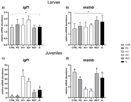 Figure 4. Relative mRNA abundance of genes involved in growth analyzed in whole larvae or in liver samples from juveniles. (a) igf1 and (b) mstnb in larvae; (c) igf1 and (d) mstnb in juveniles. Results are expressed as mean + SD (n = 5). a,b Different letters denote statistically significant differences among the experimental groups; ns, no significant differences.