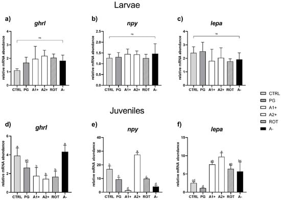 Figure 5. Relative mRNA abundance of genes involved in appetite regulation analyzed in whole larvae or in intestine (ghrl), brain (npy), and liver (lepa) samples from juveniles. (a) ghrl, (b) npy, and (c) lepa in larvae; (d) ghrl, (e) npy, and (f) lepa in juveniles. Results are expressed as mean + SD (n = 5). a–d Different letters denote statistically significant differences among the experimental groups; ns, no significant differences.