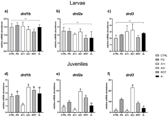 Figure 6. Relative mRNA abundance of genes involved in reward system analyzed in whole larvae or in brain samples from juveniles. (a) drd1b, (b) drd2a, and (c) drd3 in larvae; (d) drd1b, (e) drd2a, and (f) drd3 in juveniles. Results are expressed as mean + SD (n = 5). a–e Different letters denote statistically significant differences among the experimental groups; ns, no significant differences.