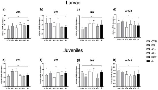Figure 7. Relative mRNA abundance of genes involved in immune and stress response analyzed in whole larvae or intestine (immune response: il1b, il10, and litaf) and liver (stress response: nr3c1) samples from juveniles. (a) il1b, (b) il10, (c) litaf, and (d) nr3c1 in larvae; (e) il1b, (f) il10, (g) litaf, and (h) nr3c1 in juveniles. Results are expressed as mean + SD (n = 5). ns, no significant differences.