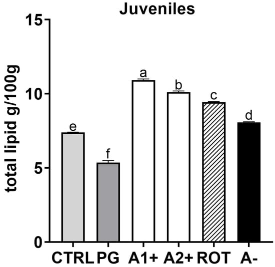 Figure 8. Total lipid content (g/100 g) of zebrafish juveniles. a–f Different letters show statistically significant differences among experimental groups (p < 0.05). Values are reported as mean + SD (n = 3).