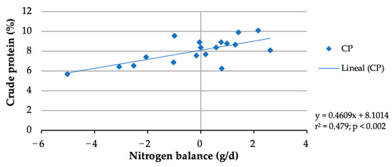 In this study, although buffelgrass contained 6.47%, due to forage selection, the crude protein of rejected forage ranged from 4.98 to 5.19%. The nitrogen balance data from two doelings were discarded due to urine lost from two metabolic cages during the 9-day urine-collection period. Whereas forage nitrogen intake did not differ (p > 0.05) among the treatments, block nitrogen intake increased (p < 0.001) from 1.065 g/d with the block without urea to 4.6 g/d with the block with 6% urea (Table 4), resulting in an increasing total nitrogen intake from 7.180 g/day to 10.605 g/day. No significant (p > 0.05) increase in fecal or urine N excretions was observed with an increasing block urea inclusion level (Table 4). With more urea in blocks, nitrogen retention (p = 0.005) and N balance (p = 0.010) linearly increased. Nitrogen balances shifted from negative (−2.458 g/day) for doelings consuming blocks without urea to positive (0.895 g/d) for those consuming the 6% urea blocks. Doe nitrogen retention shifted from negative (−35.93%) for blocks without urea to positive (10.06%) for the 6% urea block. The nitrogen balances of the doelings increased with more crude protein consumed (Figure 1). Considering a zero N balance, the maintenance CP requirement of the doelings was calculated to be 8%.