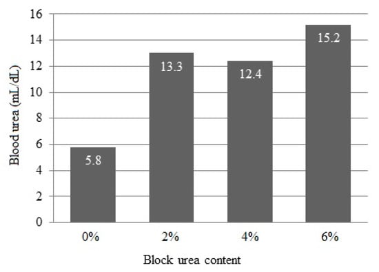 Blood urea concentrations linearly increased (p < 0.001) from 5.8 to 15.2 mg/dL as the urea inclusion in blocks increased (Figure 2).