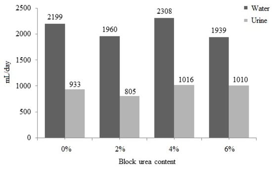 No significant difference (p > 0.05) was observed between water intake and urine excretion with an increase in the urea level in the blocks (Figure 3). Water intake ranged from 1939 to 2308 mL/day, and urine excretion ranged from 805 to 1016 mL/day. With a higher block intake, increases in water consumption (r = 0.442; p = 0.051) and urinary excretion (r = 0.441; p = 0.051) were observed. These data also suggest that as block intake increased, fecal excretion increased (r = 0.540; p = 0.014) and DM digestibility was reduced (r = −0.525; p = 0.018).
