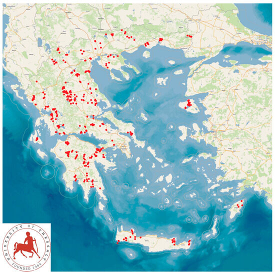 Locations (red dots) of 444 small ruminant dairy farms around Greece, in the 13 administrative regions of the country, which were visited during the countrywide investigation.