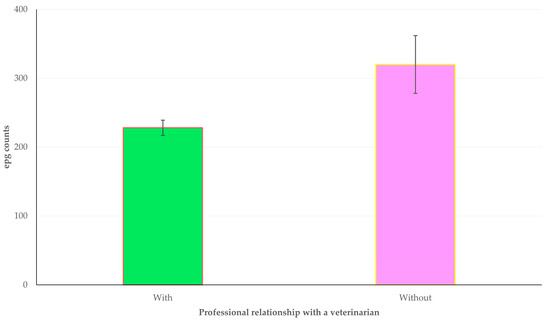 Mean epg counts in faecal samples among farms with (green bar) or without (pink bar) professional relationship with a veterinarian, as found in a countrywide cross-sectional study in 444 small ruminant farms in Greece.