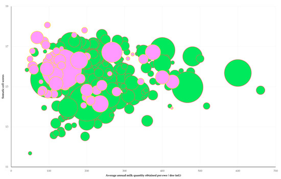 Average annual milk production per ewe/doe (horizontal axis), somatic cell counts in bulk-tank milk (vertical axis) and annual incidence of clinical mastitis (diameter of bubbles) among farms with (green-coloured bubbles) or without (pink-coloured bubbles) a professional relationship with a veterinarian, as found in a countrywide cross-sectional study in 444 small ruminant farms in Greece.