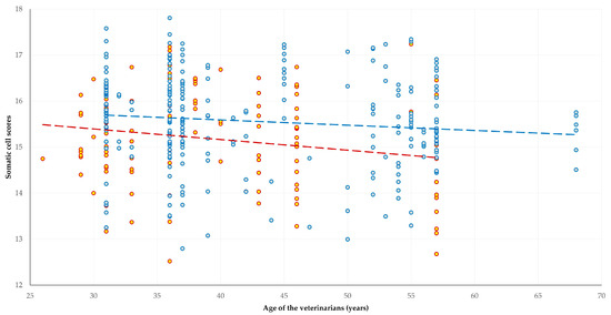 Somatic cell counts in the bulk-tank milk, in accord with the gender (red-yellow dots: female; blue-grey dots: male) and the age of the veterinarians among farms with a professional relationship with a veterinarian, as found in this countrywide cross-sectional study among 384 small ruminant farms in Greece (red and blue dashed lines are respective trendlines).