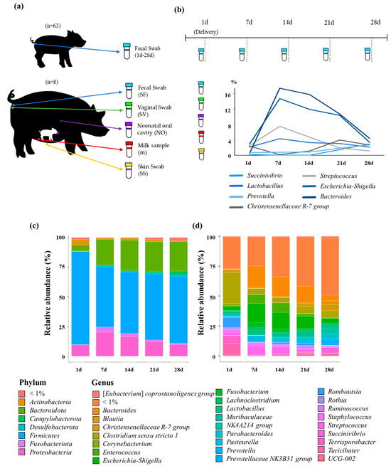 Microbiome sample collection and intestinal microbiome development in piglets 28 d after birth. (a) Fecal (SF), skin (SS), milk (m), and vaginal (SV) samples were collected from the sows, and fecal and neonatal oral cavity (NO) samples were collected from the piglets. For piglets, sampling commenced within 24 h of birth and continued up to 28 d. All samples were subjected to 16S rRNA amplicon sequencing of the V3–V4 region. (b) Changes in the microbial composition in piglet intestines at specific time points. (c,d) Stacked bar plots showing the average taxonomic composition of bacteria in piglet feces; (c) phylum level; (d) genus level (relative abundance > 1%).