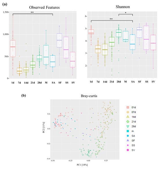 Comparison of bacterial diversity between piglets (n = 63) and sows (n = 8). (a) Boxplots showing the alpha diversity indices (observed features and Shannon diversity, * p < 0.05, ** p < 0.01). (b) Principal coordinate analysis (PCoA) plot comparing the beta diversity of piglet and sow microbiota based on Bray–Curtis distances. m, sow milk; NO, neonatal oral cavity; SF, sow feces; SS, sow skin; SV, sow vagina.