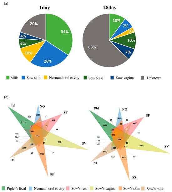 Influence of sow microbiota on the formation of the intestinal microbiome in piglets. (a) Contribution of microbial sources in sows to the intestinal microbiome of 1 d and 28 d old piglets. The proportion of “source” from the piglets was estimated from different maternal sources (colored regions) using SourceTracker. (b) Number of microbes shared by the sows and piglets. m, sow milk; NO, neonatal oral cavity; SF, sow feces; SS, sow skin; SV, sow vagina.