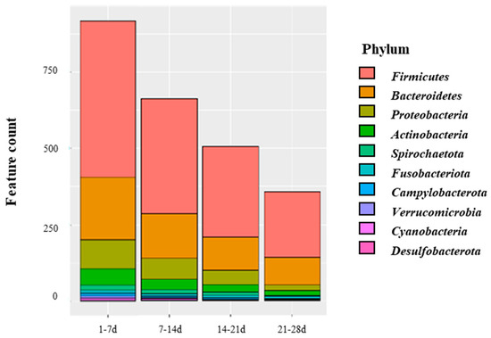 Notably, a portion of the early intestinal microbiome derived from sows is retained despite changes in various environmental factors, such as the hog barn, feed, water, stocking density, management, and temperature. Moreover, a balanced intestinal microbial environment is crucial for piglet growth and health [], highlighting the importance of the early microbial community derived from sows. Therefore, it is necessary to investigate changes in the fecal microbial composition of piglets during the lactation period when piglets cohabitate with sows. The present study investigated dynamic changes in the fecal microbial composition of piglets during lactation and analyzed the relationship between the fecal microbiome of piglets and sows, and their environment from birth to weaning.
