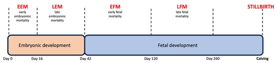 Dairy cattle show a higher incidence of pregnancy loss than other domesticated ruminant species, and these losses occur mostly at the late embryonic and early fetal stages of gestation. This timing affects the method of pregnancy diagnosis [1], such that after an initial diagnosis of pregnancy, its confirmation is required for acceptable farm-level clinical results. The embryonic developmental part of gestation ends on day 42 of pregnancy (Figure 1) [2]. From this point, fetal development ensues.