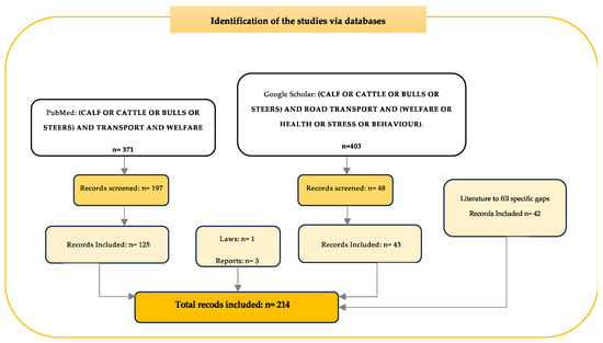 The PRISMA (Preferred Reporting Items for Systematic Reviews and Meta-Analyses; and Reporting Literature Searches in Systematic Reviews) protocol was adopted in this literature review [28,29]. The literature reviewed in this manuscript were searched for on the PubMed database (https://pubmed.ncbi.nlm.nih.gov, accessed on 2 September 2022) using the terms “CALF” OR “CATTLE” OR “BULLS” OR “STEERS” AND “TRANSPORT” AND “WELFARE”. The search was performed in September 2022, January 2023, and May 2023. In addition, Google Scholar was also used to include more peer-review publications and grey literature using more specific terms of search as “CALF” OR “CATTLE” OR “BULLS” OR “STEERS” AND “ROAD TRANSPORT” AND “WELFARE” OR “HEALTH” OR “STRESS” OR “BEHAVIOUR”. Other peer-reviewed manuscripts, books, institutional reports, government publications, and PhD theses with English as the publication language were included to fill the literature gaps not found using the terms described above (Figure 1). Year of publication was not an exclusion criterium.