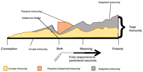The age of the cattle transported can have a significant effect as instances of morbidity and mortality increased in transported calves younger than 3 weeks of age [113]. Swanson and Morrow-Tesch reported that transport might be more stressful in older (>3-month-old) compared to young (<4-week-old) cattle due to reduced lying and ruminating and greater salivation, defaecation, and urination in older cattle [1]. Kent and Ewbank reported similar observations [62]. However, younger calves do not show the same HPA response as older calves, and this complicates the evaluation of transport stress in younger calves [93]. The immune components of calves are not completely functional at 2 weeks of age, and they are in the so-called “immune gap period” due to the combination of decreasing passive immunity and the absence of a mature adaptive immune system (Figure 2) [114]. A recent study by Marcato et al. found that calves transported to a veal farm at 4 weeks of age showed more advanced adaptive immunity development than calves transported at 2 weeks of age [41], even though those calves were still in the “immune gap period”. A calf’s immune system does not reach full maturity until they are ~6 months of age (Figure 3) [115,116,117]. Transport during this period increases the risk of mortality and morbidity, especially regarding bovine respiratory disease and diarrhoea: mortality rates ranged from 0.06% to 0.7% in the 24–30 h after calves’ arrival [118,119], and between 33% and 96% of young calves were treated with antimicrobial medication during the first few weeks after transport to the rearing farm [40,120]. Therefore, for the more successful transportation of unweaned calves, colostrum provision at birth is crucial. Furthermore, although increasing the transport age of unweaned calves from 2 weeks to 4 weeks of age results in more robust calves facing transport [41], the care and welfare of the calves that stay longer at their original dairy farm cannot be jeopardized as all the benefits of increasing age at transport will be impaired.