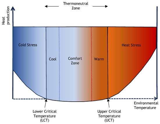 Schematic representation of thermal zones as a function of the environmental temperature. The thermoneutral zone for animals is the range of temperatures below which an animal feels cold and has to divert extra energy for heat production and above which it feels hot and reduces its heat production by decreasing feed intake (adapted from EFSA Scientific Opinion [24]).