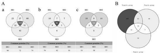 (A) Protein overlaps between replicates from cow placenta extracted by different proteases. Proteins obtained from cow placenta with trypsin (a), pepsin (b), and papain (c) were run in triplicate biological replicates. Data were processed using MaxQuant (version 1.5.3.17) with a protein FDR of 1%. (B) Identified common and unique quantifiable proteins between TRY, PEP and PAP. For each comparison, the total number of the quantified proteins per protease as well as common and unique proteins have been presented as number and percentage.