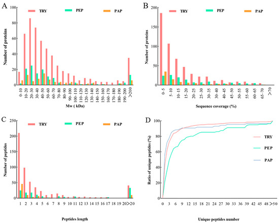 Qualitative and quantitative analysis of quantifiable proteins in cow placenta extracted with trypsin, pepsin, and papain. Analysis was performed based on the distribution of proteins according to: (A) molecular weight, (B) Sequence coverage, (C) Peptide length, (D) Unique peptides number.
