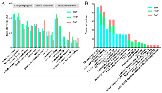 (A) Gene ontology (GO) analysis of quantifiable proteins. Functional assignments of proteins’ corresponding associated biological processes, molecular function, and cellular components are shown. The number of DEPs that could be assigned to the different categories is indicated. Blue column indicates TRY; green column indicates PEP; red column indicates PAP. (B) KEGG analysis of quantifiable proteins (Top 10). Blue column indicates TRY; green column indicates PEP; red column indicates PAP. Under the x-axis are KEGG terms; above each term is the number of quantifiable proteins.