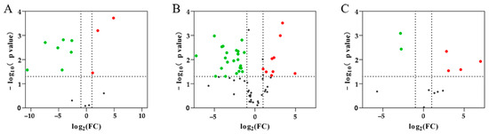 Volcano plot showing differentially abundant proteins between each group. (A) papain group vs. trypsin group; (B) pepsin group vs. trypsin group; (C) pepsin group vs. papain group. The X-axis is the negative log of the Fold-Change with 2 as the base, and the Y-axis is the negative log of the p-value with 10 as the base. Gray dots show no significant difference in a protein; red dots show significantly up-regulated proteins, and green dots show significantly down-regulated proteins.