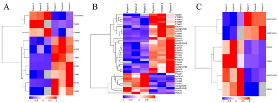 Cluster analysis of DEPs. Trypsin group vs. papain group (A); trypsin group vs. pepsin group (B); papain group vs. pepsin group (C). The hierarchical clustering results are represented by tree heat maps, in which each row represents a protein (that is, the ordinate is the protein with a significant difference), and each column represents a group of samples (Abscissa is the sample information). The logarithmic values (Log2Expression) of proteins with significant differences in expression in different samples are shown in the heat map in different colors, in which red represents significantly up-regulated proteins, blue represents significant down-regulated proteins, and gray represents the absence of protein quantitative information.